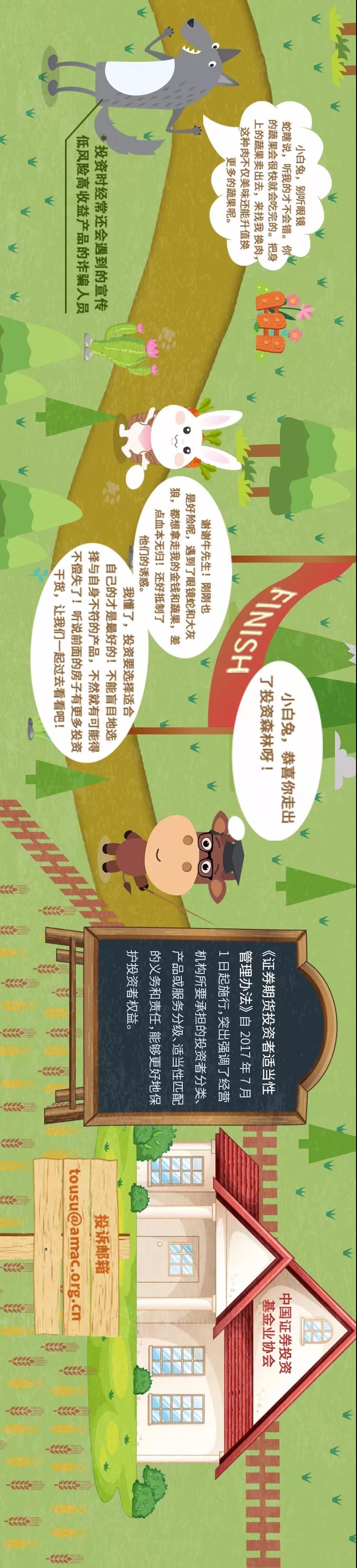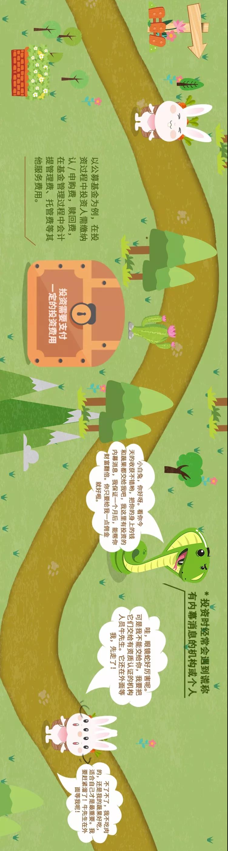 相信许多刚刚接触投资或者缺乏投资专业知识的朋友对于上述问题并不了解。中国证券投资基金业协会在3·15特别策划、推出以“奇妙森林历险记”为主题制作的投资者教育路线图,将主人公小白兔经过投资森林一路遇到的投资知识点、常见骗局等事件串联起来,以简单有趣的画面教您投资基础知识,不再做小白。